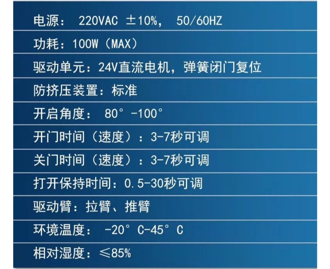 重型自動(dòng)平開門機(jī)可外接感應(yīng)器、開關(guān)、門禁、電鎖等設(shè)備。斷電后可當(dāng)普通閉門器使用。
